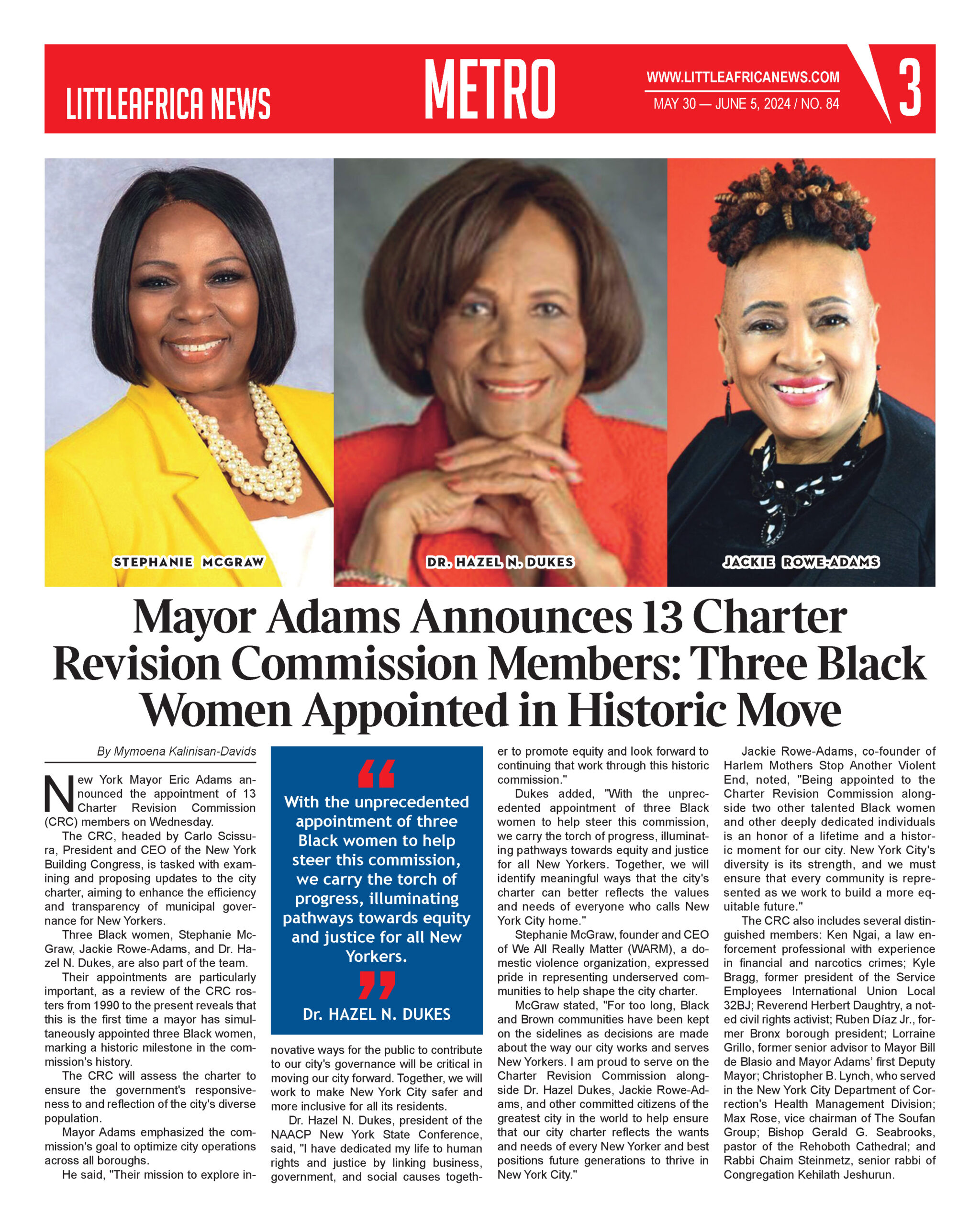 Dukes added, “With the unprecedented appointment of three Black women to help steer this commission, we carry the torch of progress, illuminating pathways towards equity and justice for all New Yorkers. Together, we will identify meaningful ways that the city’s charter can better reflects the values and needs of everyone who calls New York City home.”